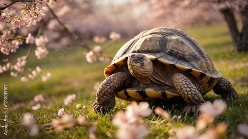 Fototapeta premium A tortoise exploring a blooming cherry blossom landscape.