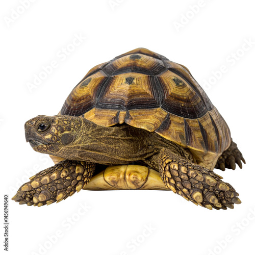 Fototapeta premium A tortoise with a patterned, dome-shaped shell and scaled legs is shown...
