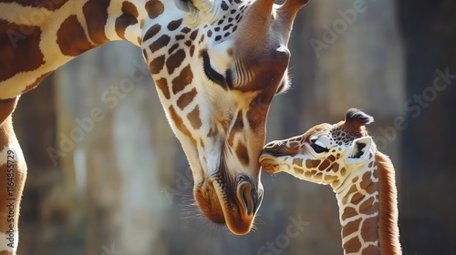 Obraz premium A touching moment between a mother giraffe and her calf, showcasing their...