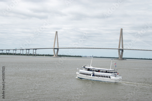 © Joseph Creamer, Fototapeta premium A tour boat on the the Cooper River in front of the Ravenel Bridge in Charleston, South Carolina during a cloudy day