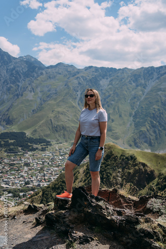 © Svetlana, Obraz premium A tourist girl against the background of the mountains and the village of Stepantsminda in Georgia. The girl is wearing a purple T-shirt, denim shorts, sunglasses and a purple bag. Space, freedom