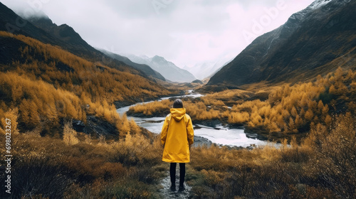 Naklejka premium A tourist in a yellow raincoat stands against a mountain landscape background.