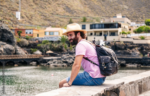 Fototapeta premium A tourist man with hat and backpack through a village on the coast of El...