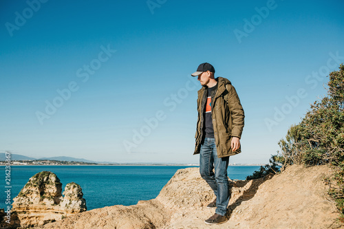 Naklejka premium A tourist or traveler with a backpack walks along the coast of the Atlantic Ocean and admires the beautiful view of the ocean near the city called Lagos in Portugal.
