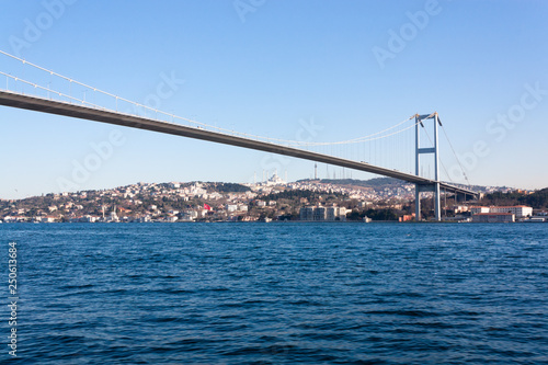 Naklejka premium A tourist ship sails through the Bosphorus. Istanbul, Turkey. View of the...