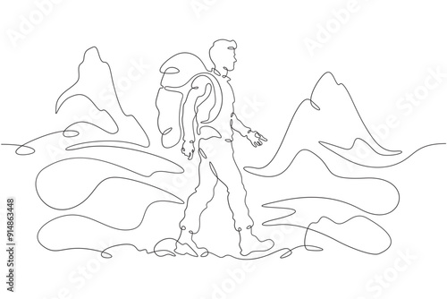 © derplan13, Obraz premium A tourist walks in the mountains. Travel. Mountain climbing .Tourist with a backpack.One continuous line. Line art. Minimum one line. White background. One line drawing.