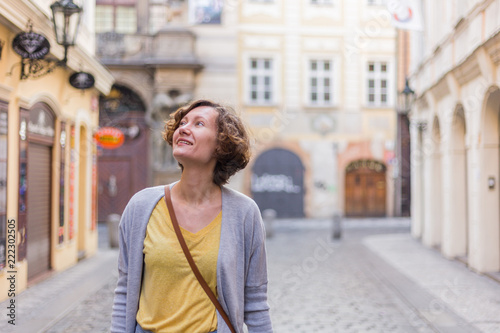 © vitaprague, Obraz premium A tourist woman is walking around Prague on a sunny day.