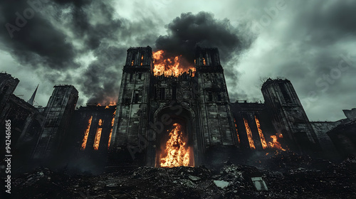 Fototapeta premium A towering gothic cathedral engulfed in flames, with dark clouds billowing in...