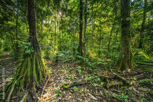Obraz premium A towering kapok tree in the Amazon rainforest, surrounded by dense greenery and smaller plant species