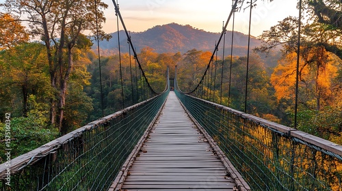 © Nosheen, Obraz premium A towering mountain, with a wooden bridge crossing through misty clouds, and clear, bright skies framing the majestic scene.