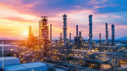 © Sampao, Obraz premium A towering oil refinery with large distillation columns in an industrial zone.