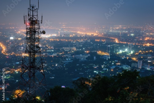 Fototapeta premium A towering structure stands tall against a backdrop of a city illuminated by...