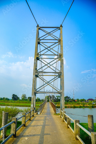 © Slaf, Fototapeta premium a towering suspension bridge tower with an iron frame structure against a clear sky backdrop for advertising space. A steel suspension bridge spans a river flanked by greenery under a bright blue sky.