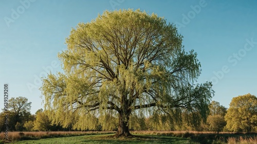 Obraz premium A towering verdant tree basks beneath a clear azure sky, its lively green...