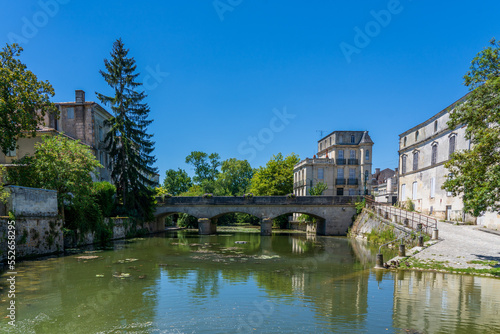 © Ieva, Fototapeta premium A town view of a river in the French city of Jonzac