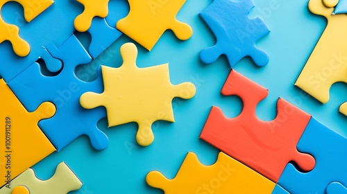 © Robert, Obraz premium A toy puzzle with colorful pieces on a blue and yellow background
