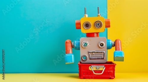© Robert, Fototapeta premium A toy robot with a toolbox on a blue and yellow background