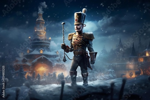 © DM , Fototapeta premium A toy soldier stands in a snowy, whimsical town at night.