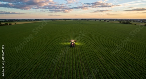 © ekalaila, Obraz premium A tractor illuminated working on a large green field