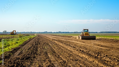 © G.Go, Fototapeta premium A tractor is driving down a dirt road in a field