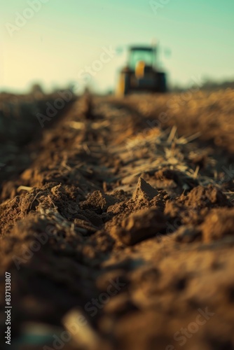 © vefimov, Fototapeta premium A tractor is driving through a field of dirt