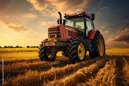 Fototapeta premium A tractor parked in a field at sunset. Perfect for agricultural, farming, or...