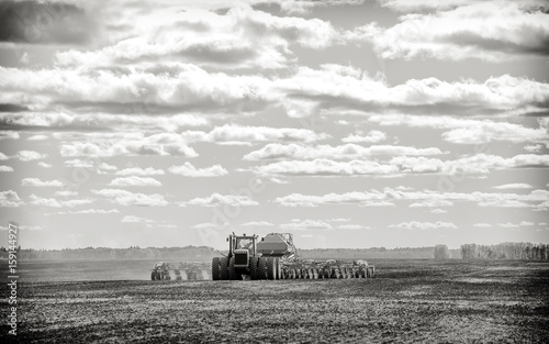 © kat7213, Obraz premium A tractor pulling a seeder and fertilizer tanks planting a crop in a black and white countryside summer landscape