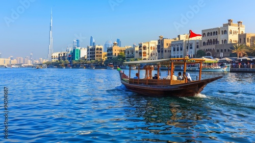 © Pornnapa, Obraz premium A traditional abra ride across Dubai Creek. The scene includes the wooden boat, historic buildings, and bustling waterfron