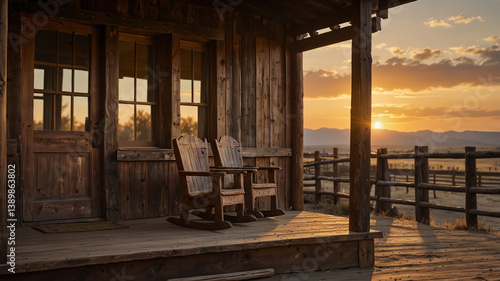 © Ms Bella Belle, Fototapeta premium A traditional African tribal hut porch, thatched roof shading wooden chairs, woven baskets and pottery placed nearby, warm earthy tones