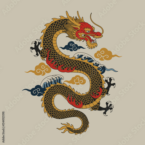 © vector Art, Obraz premium A traditional Asian dragon artwork featuring a fierce, coiled dragon with a golden and black color scheme.