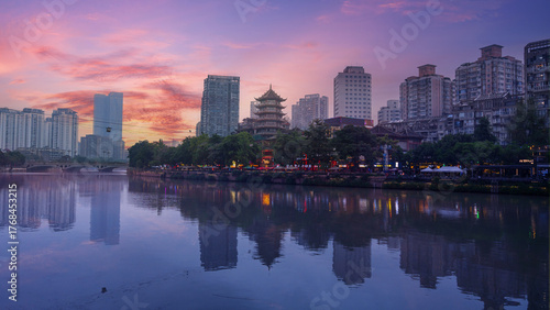 © banphote, Fototapeta premium A traditional Chinese pagoda standing by the riverside amid modern high-rise buildings in Chengdu, China. The sunset sky adds warmth to the balance between old and new
