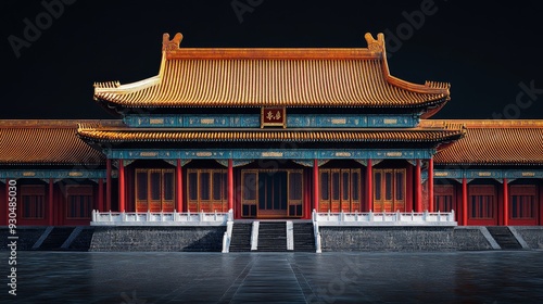 © Edo, Fototapeta premium A traditional Chinese palace with a golden roof and red pillars, set against a black background.