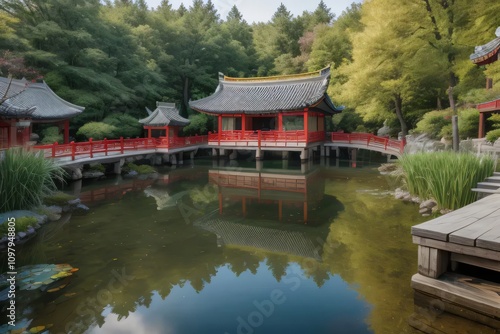 Fototapeta premium A traditional Chinese pavilion reflected in a serene pond, surrounded by lush...