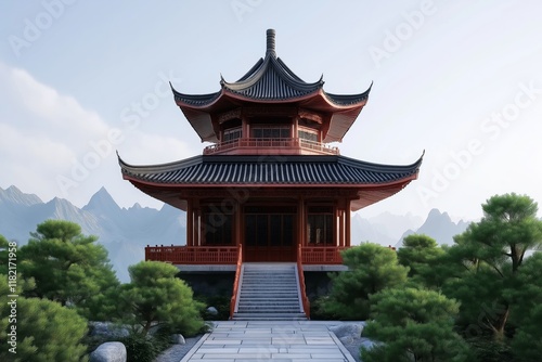 Obraz premium A traditional Chinese pavilion stands elegantly amidst lush greenery, with majestic mountains in the background. The architecture reflects cultural heritage and tranquility