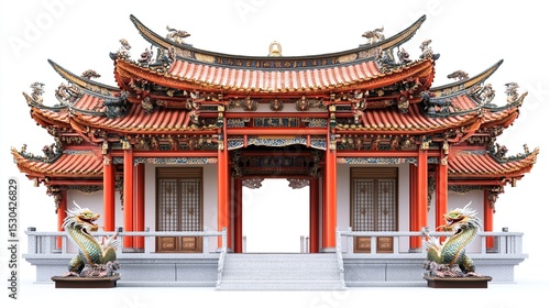 © Satria, Obraz premium A traditional Chinese temple with a red and gold roof, intricate carvings, and two guardian dragons. It has a large, open entryway with double doors