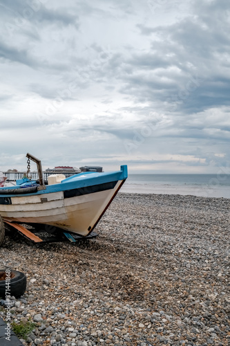 Naklejka premium A traditional crab fishing boat on the shingle at Cromer beach after a morning at sea setting crab pots. This is portrait orientation with copy space