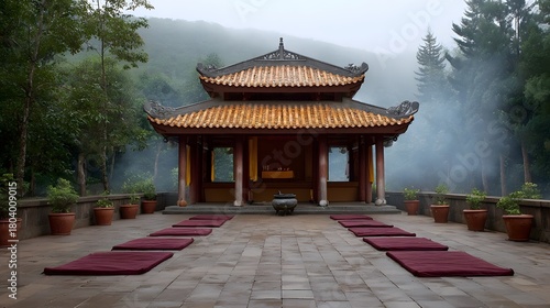 © Bussakon, Fototapeta premium A traditional East Asian pavilion stands serenely on a paved courtyard with rows of meditation mats set against a misty mountainous backdrop