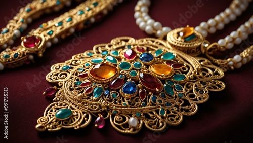 © Mx, Obraz premium A traditional Indian necklace with intricate gold filigree and colorful gemstones, set against a velvet backdrop, perfect for Traditional Indian jewelry
