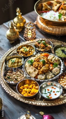 Fototapeta premium A traditional Indian thali with various dishes arranged on a silver platter,...