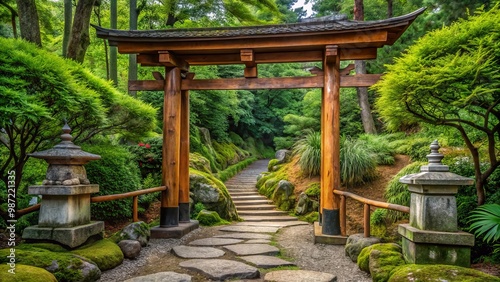 Naklejka premium A traditional Japanese arch stands tall, enveloped by vibrant foliage and...