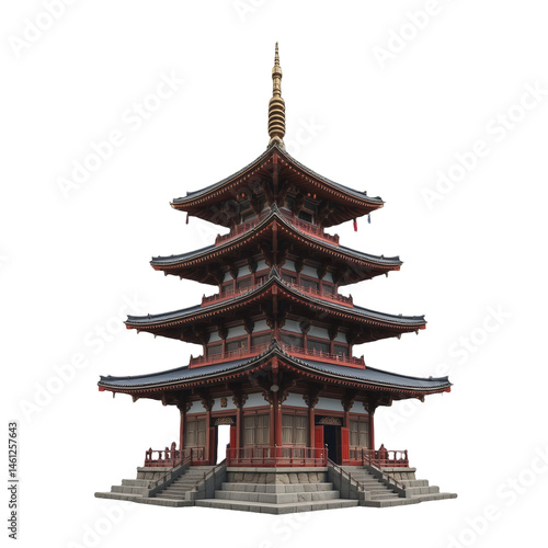 Fototapeta premium A traditional Japanese pagoda with intricate wooden details, tiered rooftops, and red accents, exemplifying classic Eastern architecture