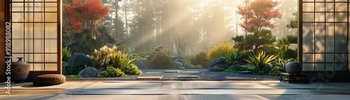 © ngstock, Obraz premium A traditional Japanese sliding door with shoji paper panels, set within a serene Zen garden