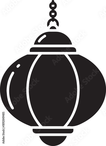 Obraz premium A traditional lantern hanging from a chain, black illustration on a white background, viewed from the front