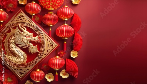 Fototapeta premium A traditional Lunar New Year scene with red paper lanterns, golden dragon motifs, and glowing festive decorations