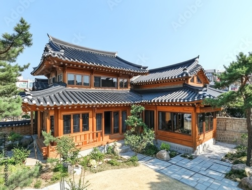 Obraz premium A traditional style wooden building with tiled roof and surrounding garden