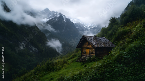 © Fonlinepix, Fototapeta premium A traditional wooden hut with a thatched roof, surrounded by alpine flora and a breathtaking view of the mountain range in the background.