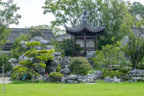 © Doublelee, Obraz premium A tradtional Chinese garden featuring ornate rockery, pavilion or gazebo with curved roofline, and lush greenery, stone formations, manicured lawn, and classical architecture.