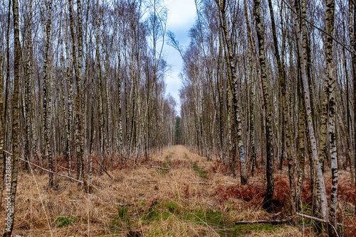 Fototapeta premium A trail in a birch tree plantation in winter.