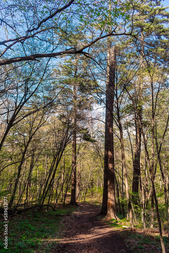 © Tishina, Fototapeta premium A trail in the woods with the sun shining through the trees.
