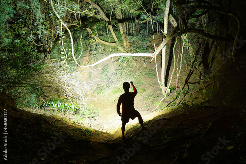 Fototapeta premium A trail runner using a flashlight in dark forest